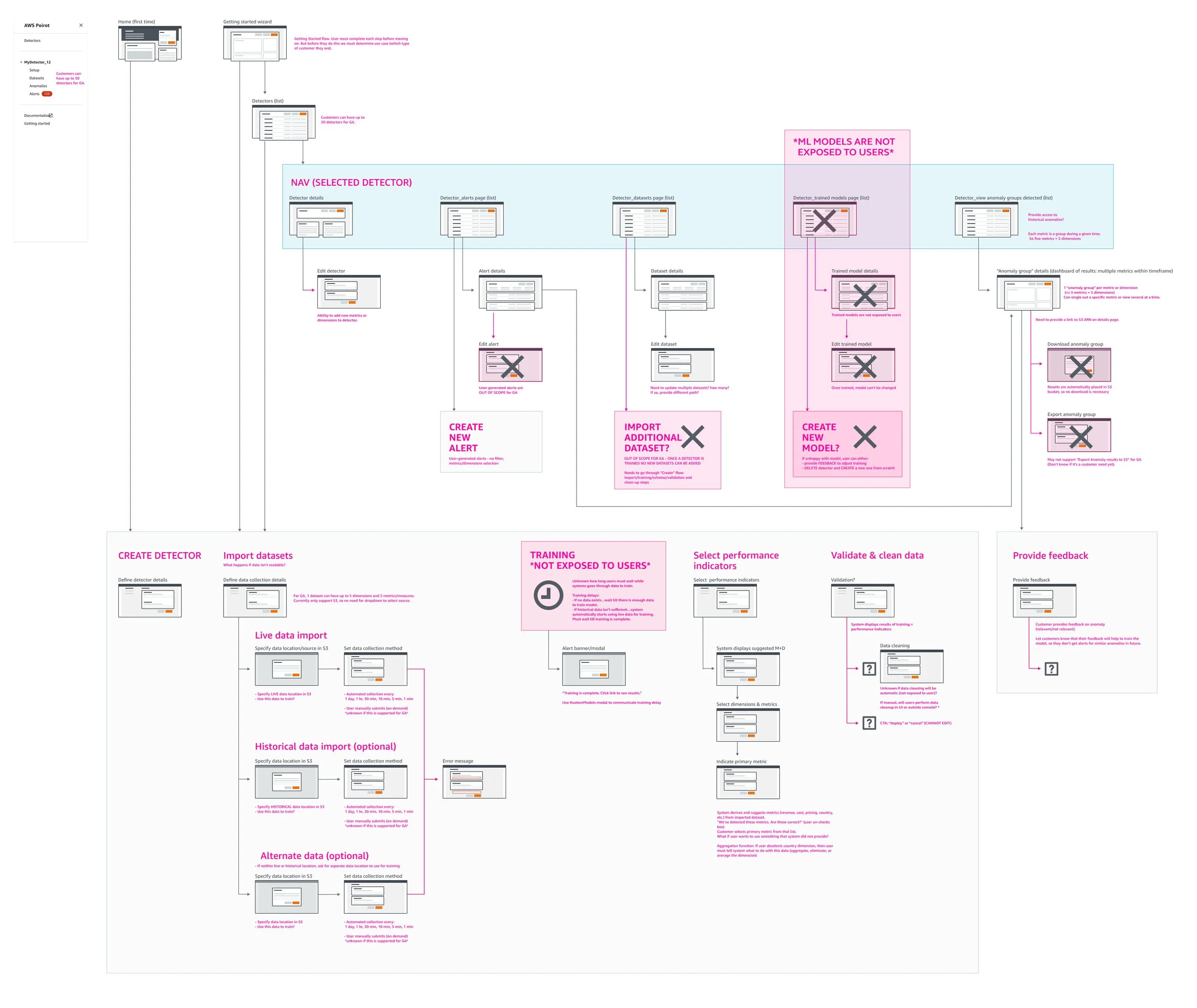Blue: navigation. Grey: wizard. Magenta: needs clarification. Red: out of scope.
